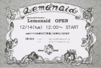 | ついにLemonaidがオープン! Lemonaidさんが12月14日(火)にお店をオープンされます。パチパチパチ〜。Lemonaidのコンセプトでもある「自分らしくかわいい女性のためのアクセサリー」はもちろんのこと、ショールーム、ウエディングアイテム、ワークショップもやられるそうですよ。私もとっても楽しみです。Lemonaidファンの方はもちろん、アクセ好きな方はぜひ足を運んでみてはいかかでしょう。 ADD:名古屋市中区丸の内3−22−10 TEL&FAX:052−253−6462 OPEN:12:00〜19:00 日曜・月曜日休み 地下鉄名城線・桜通線「久矢大通」1番出口より徒歩5分 |