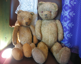 | ハンガリーの蚤の市で出会った1930年代のくまちゃんたち。 大きいくまさんが一匹旅立ちましたので、淋しくなり新たに登場させました。兄弟くまもよろしく。 |
