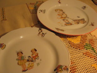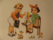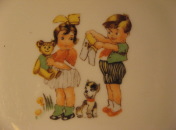 | 商品入荷のお知らせ チェコスロヴァキア時代の絵皿です。 絵本のワンシーンから出てきたみたいにほんわりとした絵柄の物語を想像しながらお楽しみ下さい。 ちなみに主人が想像した物語ですが(左下の絵柄) 先生と言えば丸メガネだと思い込み、目も悪くないのにメガネをかけて先生ごっこをしている少年と、次は私のお人形ごっこなのに早くしてよと心の中で思う少女だそうです。 どう想像するかは本人の勝手ですが、聞く相手を間違えました。せっかくの可愛い絵皿が台無しです。 |
