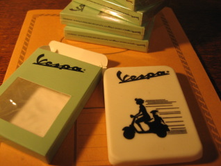 | イタリアつながりでVespaの消しゴム。 若かりし頃は「ローマの休日」に憧れVespaにオードリー似の彼女を乗せてソフトクリームでも食べに行きたかったのですが、何分この風貌とVespaを買うお金もなく儚い夢で終わりました。 |