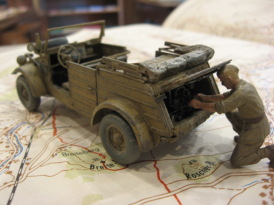 | こちらは、ワーゲンバスを毎日気にかけて出勤して下さるお客様より貴重なものを見せて頂きました。 キューベルワーゲン(アフリカ使用)です。 写真では分かりにくいですが、エンジンもすごく細かく再現されていて、バルーンタイヤを使っています。軍人さんの汗のテカリ具合や指先の汚れも施されていて、このマニアック振りに脱帽です。 小さい頃、おもちゃ屋さんでプラモデルのジオラマ大会がありました。今でもそういう大会があれば是非参加してもらいたいです。 |