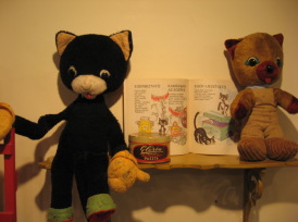 | 商品入荷のお知らせ にゃんこのぬいぐるみ。 チェコのバザールで段ボールの奥底に追いやられていたところを救出。縄張り争いに敗れたのか、二匹とも多少かすり傷を負っています。 |