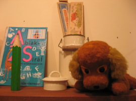 | やたら、平べったいワンコ。この子もチェコのバザールで発見。 店内の棚の上から熱い視線をお客様に投げかけております。 |