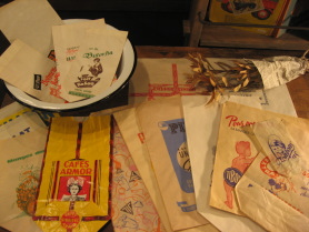 | ドイツやフランスのペーパーバック。 ペンメーカーのものやコーヒー豆の袋、チーズやバターの包み紙などのデッドストック品が入荷しました。 紙袋ひとつとっても、お国柄が出ます。 古い紙袋を購入して下さって、ラッピングはこれでと希望される方も中にはいらっしゃいます。たいてい私がラッピングしますが、こういった応用編になると、主人は必ず逃げます。 |