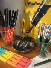 | ハンガリーのノック式ボールペン(青色)や赤と青の2色鉛筆、ICO社シャーペンの替え芯、ドイツはペリカン社のカラフルな消しゴムが並びました。このロゴにやはり惹かれます。 消しゴムはそんなに売れるものではないですが、しつこく仕入れています。 そういえば、、、うちのお店の売れ筋商品って、、、なに? |