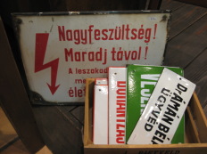 | ハンガリー語の看板プレート。 番地プレートや「電圧注意!」「出口」の表札や「No Smoking」などがあります。 看板を売っていたお兄さんブースの横で日本人の女性が日本の物を売っていたのには笑えました。少しお話をして、また来た時は遊びに来てと名刺を頂いたので、今度訪ねてみようかな。 他にも、ほうろうものなどが並んでいます。 |