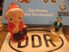 | ドイツ生まれのサンドマン。 昔は親の言うことを聞かず、寝ない子には「サンドマンが来て目に砂を入れ込むぞ〜。」と脅して寝かしつけたそうです。今は毎日楽しいお話をして、最後に眠くなる魔法の砂を撒くという優しいキャラに変わっています。 ソフビとプッシュトイのサンドマンが新たに加わりました。相変わらずの童顔です。 |