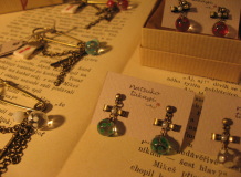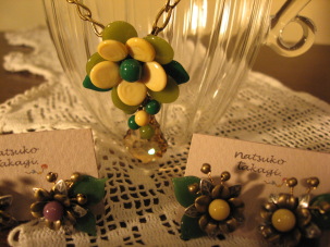 | 商品入荷のお知らせ natsuko takagiの新作アクセサリー。 先日まで某ギャラリーで開催されていたnatsukoさんの展示会を見に行きました。とても素敵な雰囲気で、心地良い時間を過ごさせて頂きました。 トルソーにかけられていたガラスで作られたお花のネックレスに一目惚れ。すごく気に入っていたら、後日持ってきてくれました。レトロな色合いと大きなスワロフスキーがなんともゴージャス。 涼しげなドット柄のピアスやブローチ、上品なシルバーリング、お揃いでつけたいランプシェードのようなピアスとリング、どれも素敵です! |